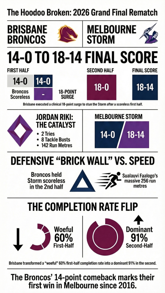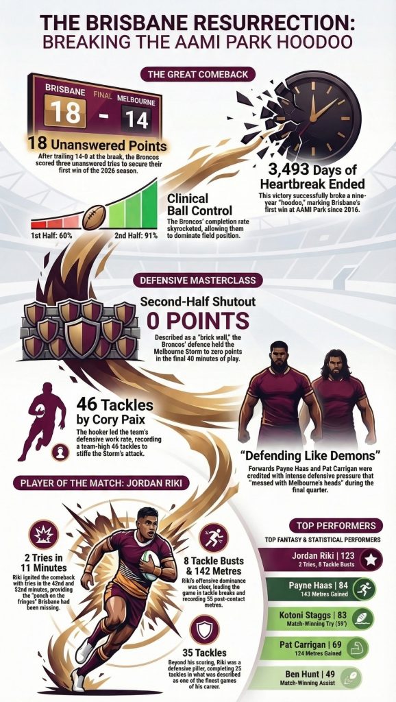 Then Brisbane flipped it — not with chaos, but with control — piling on 18 unanswered points to stun Melbourne 18–14 and rip up the AAMI Park script in the process.