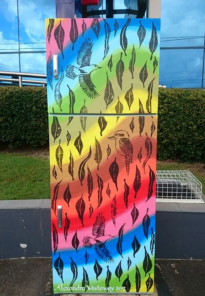 Alexandra Westaway’s 2017 piece at the busy intersection of Milton Road, Baroona Road and Park Road takes inspiration from the classic Australian children’s song. The artwork features a rainbow backdrop in colours representing the natural Australian landscape—volcanic soil reds, sky and sea blues, and the varied hues of native flora and birdlife. The piece, which earned nominations for overall winner and best adult, poses questions about the impact of rapid urban development on Brisbane’s natural spaces and quality of life.